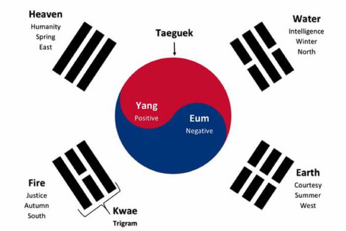 Bốn góc của quốc kỳ Hàn Quốc (Taegeukgi) được trang trí bởi 4 quẻ trong âm dương ngũ hành.