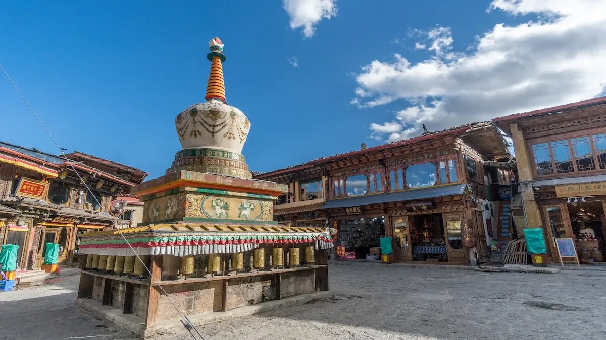 Trưa: Đoàn dùng cơm trưa tại nhà hàng địa phương. Sau đó, quý khách nghỉ ngơi trên xe và tiếp tục di chuyển đi Shangrila – đoàn sẽ được nghe HDV thuyết minh cũng như tận mắt chiêm ngưỡng “Vùng đất bất tử” trong tiểu thuyết Lost Horizon (Chân trời đã mất) của nhà văn Anh James Hilton. Theo ngôn ngữ Tây Tạng, Shangrila có nghĩa là địa điểm của vận mệnh và sự may mắn, là trung tâm của ba dòng sông lớn Dương Tử, Lan Thương- đoạn đầu của dòng sông Mekong và Nộ Giang. Đến Shangrila, đoàn ghé tham quan:
