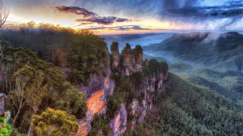 - Blue Mountains – những dãy núi và vách đá sừng sững, những hẻm núi len lỏi kỳ bí và những thung lũng sa thạch đậm một màu xanh mát của những cánh rừng khuynh diệp.