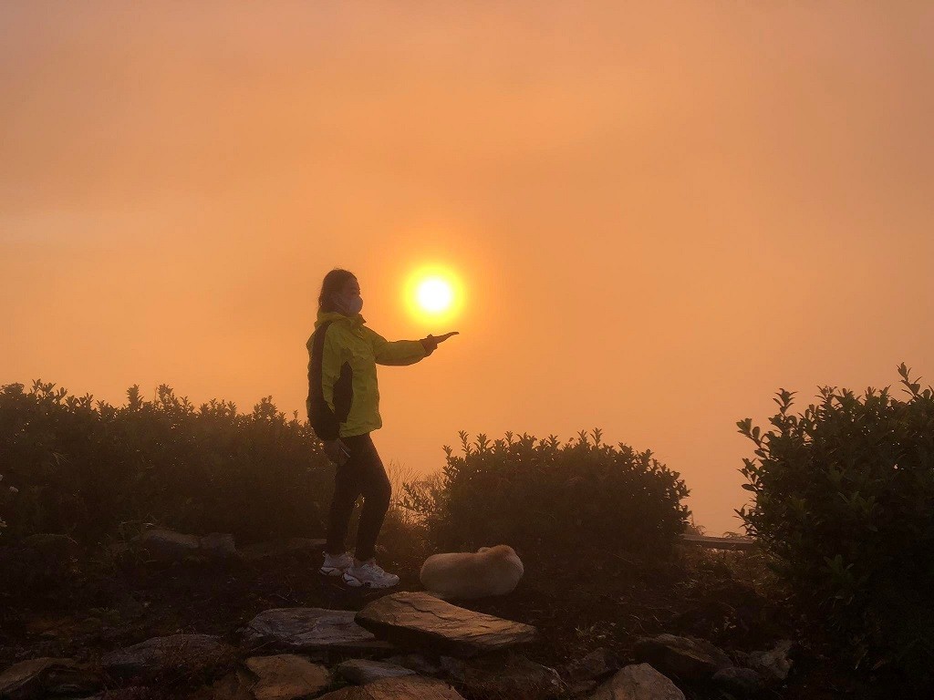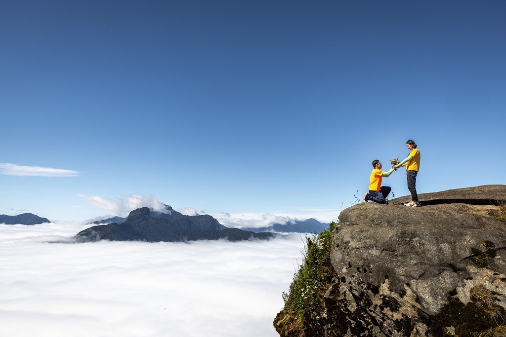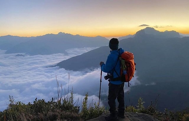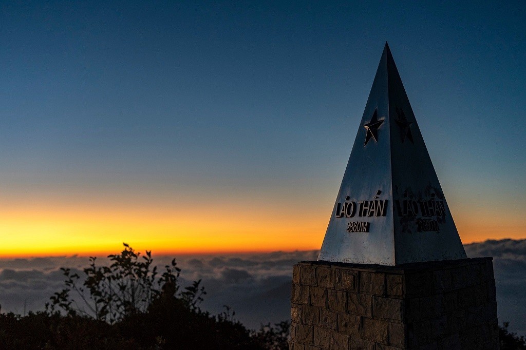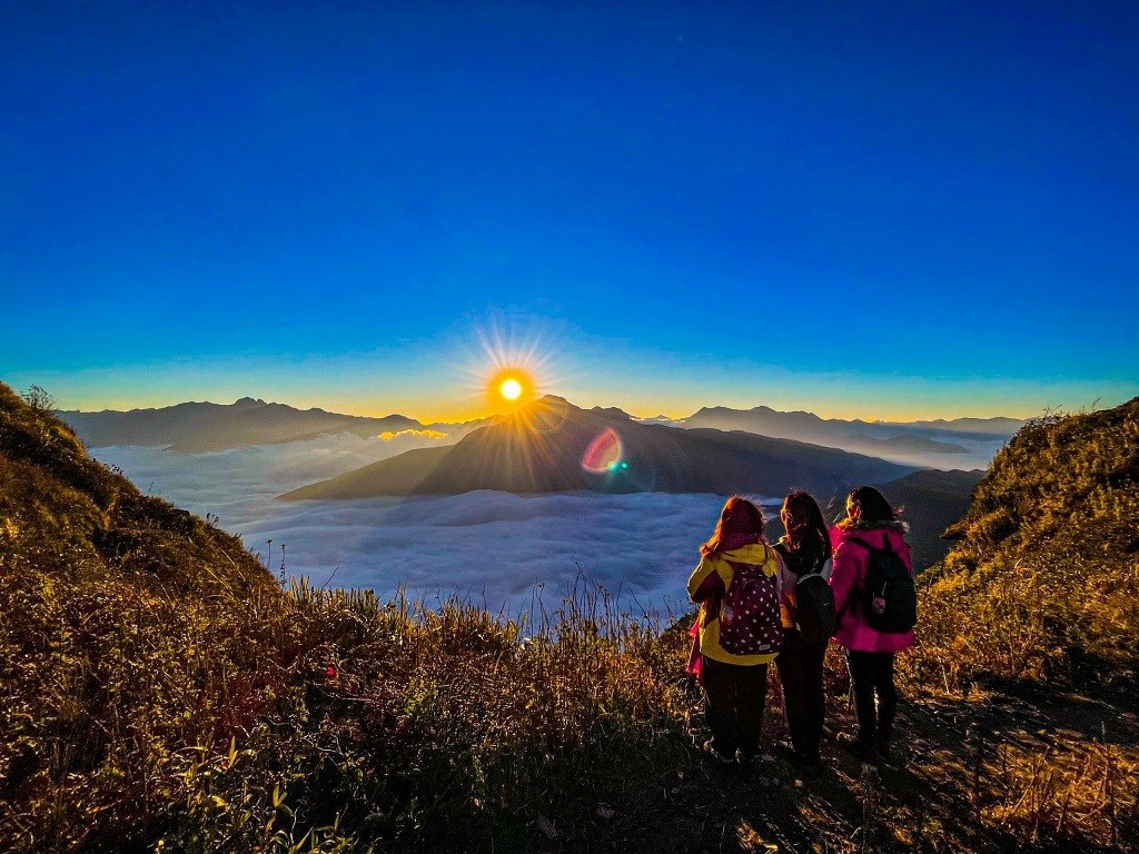 • 6h30 đoàn chạm đỉnh, tận hưởng khung cảnh mây trời hoà quyện vào nhau. Chụp ảnh check in.