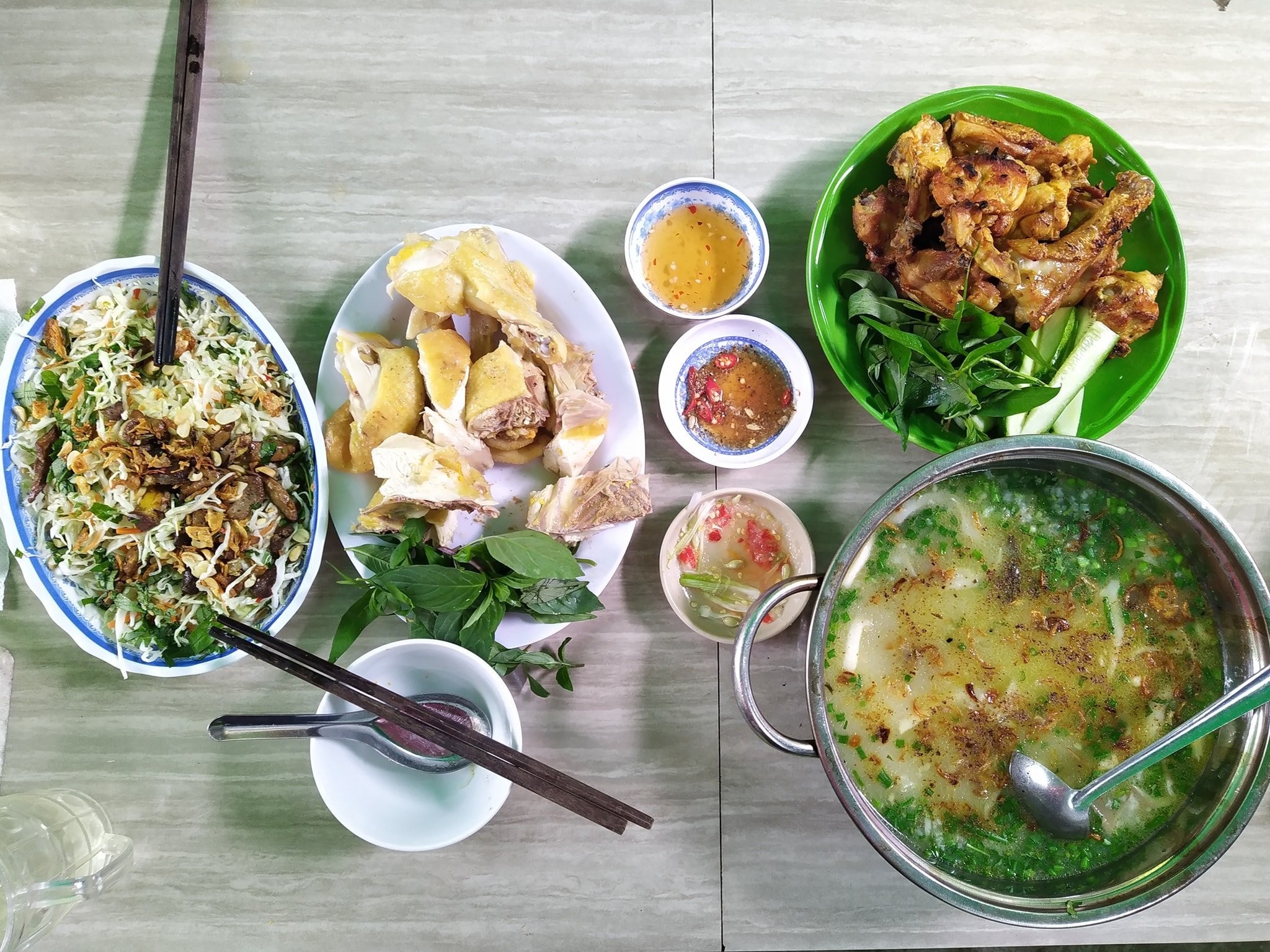 Trưa: Đoàn dừng ăn trưa ở Suối Tiên - Với món đặc sản của Núi Dinh: Chào gà, gà luộc, gỏi gà, gà nướng...